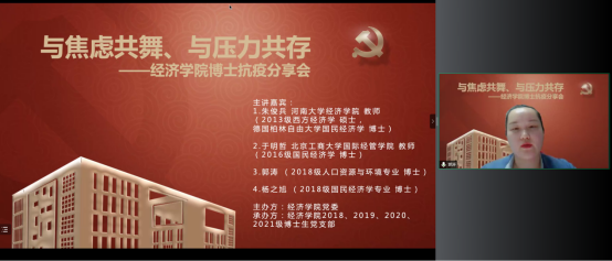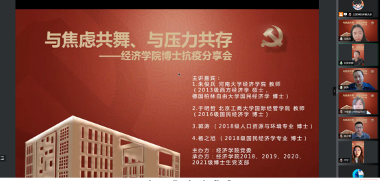 永利集团3044官网欢迎您党委在切实做好校园疫情防控工作的基础上,帮助博士生树立正确的就业择业观,缓解博士生对不同学习阶段以及未来职业生涯规划的压力,在全院博士生中深入开展了以学业规划和择业选择为主题的抗疫分享会。2022年5月14日,永利集团3044官网欢迎您特邀在高校就职的博士校友代表朱俊兵、于明哲和2018级博士党支部代表郭涛、杨之旭,充分发挥自身科研知识与专业特长,为经院博士生答疑解惑,并邀请胡志安老师作总结发言。活动由永利集团3044官网欢迎您党委组织员刘滨老师和2018级博士生党支部书记马陆共同主持,2018、2019、2020、2021级博士党支部联合承办。